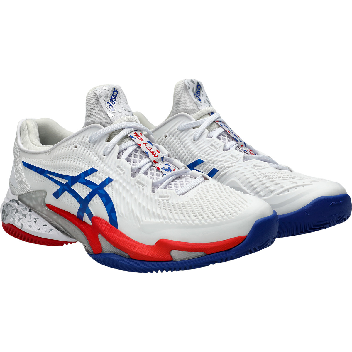 کفش زمین خاکی Asics Court FF 3 Novak Djokovic مدل جدیدی است که توسط این بازیکن صربستانی استفاده خواهد شد. این کفش علاوه بر رویهای تغییر یافته با طراحی پویاتر، پایداری بیشتری نیز ارائه میدهد. بازیکنانی که به دنبال حداکثر تطبیقپذیری هستند و نمیخواهند بین سرعت و پایداری یکی را انتخاب کنند، به این نسخه سوم جذب خواهند شد. ترکیب رنگ سفید، آبی و قرمز برای تکمیل سبک شما ایدهآل است. همچنین لوگوی نواک در پاشنه و تصویر یک کبوتر در بالای کفش دیده میشود.