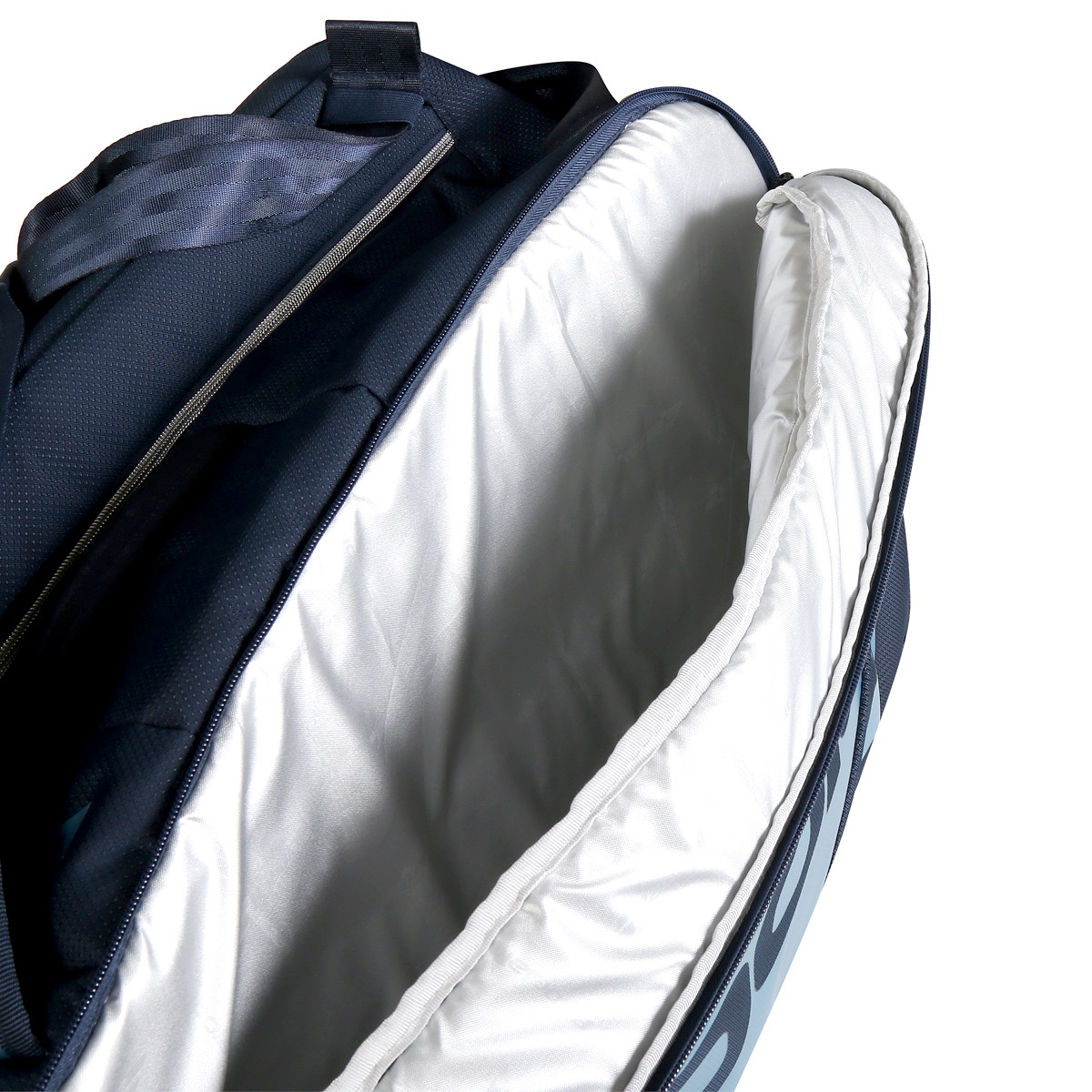 کیف تنیس Babolat Pure Drive 6 گزینه‌ای عالی برای حمل تمامی تجهیزات تنیس شماست، چرا که با برخورداری از بخش‌های متنوع ذخیره‌سازی، تمام نیازهای یک بازیکن حرفه‌ای یا نیمه‌حرفه‌ای را پوشش می‌دهد. طراحی آن با رنگ‌های آبی و سرمه‌ای کاملاً با راکت‌های سری Pure Drive هماهنگ است و ظاهری کامل و حرفه‌ای به شما می‌دهد.
